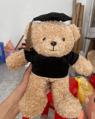Chú gấu bông trong hình là một chú gấu Teddy Bear màu nâu đáng yêu đang khoác lên mình bộ trang phục tốt nghiệp. Chú mặc chiếc áo choàng đen truyền thống cùng chiếc mũ cử nhân vuông vức trên đầu. Mũ được trang trí bằng tua rua màu vàng và một chiếc nơ nhỏ màu đỏ. Trên mặt chú là nụ cười rạng rỡ, thể hiện niềm vui và sự tự hào khi tốt nghiệp.